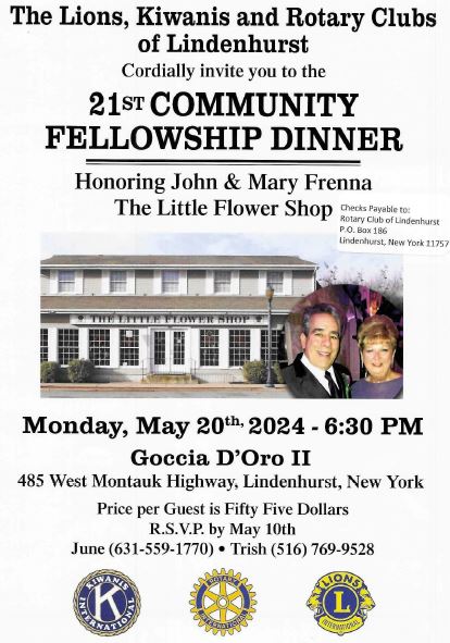 Checks payable to: Rotary Club of Lindenhurst, PO Box 186, Lindenhurst, NY 11757