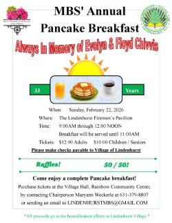 Deputy Mayor Maryann Weckerle, Chairperson of the Mayor’s Beautification Society, invites you to the Annual Pancake Breakfast on Sunday, February 22, 2026, from 9:00 AM to 12:00 PM at the Lindenhurst Fireman’s Pavilion, held in loving memory of Evelyn and Floyd Chivvis.