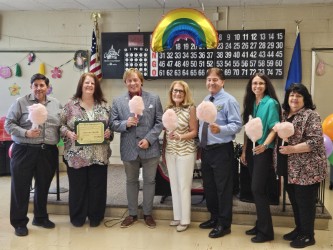 Pictured here (left to right), enjoying the cotton candy that was provided by East Neck Nursing and Rehabilitation Center, are: Village Administrator Joe Barone, Senior Center Manager Dawn Shipsey, Mayor Michael Lavorata, Trustee Maryann Weckerle, Trustee Doug Madlon, and Rainbow Center staff members Susanne Rochel & Joan Carenza.