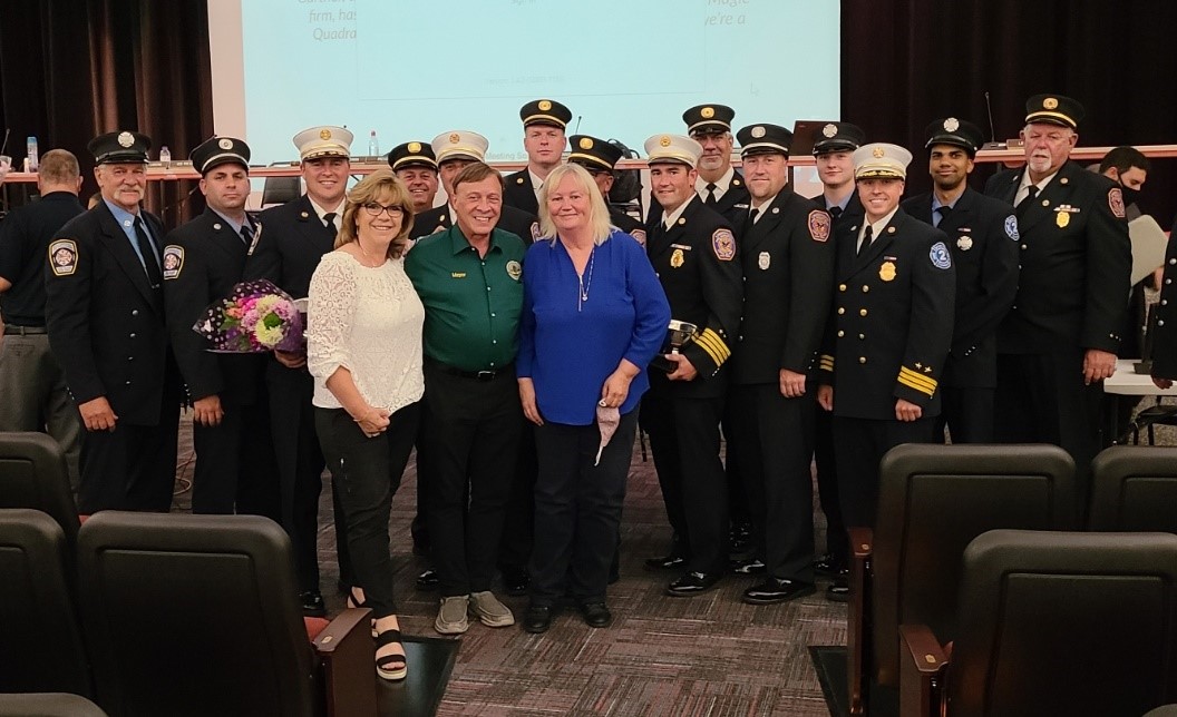 Picture here in front (left to right) with members of the Lindenhurst and North Lindenhurst Fire Departments are Board of Education Member Linda Aniello, Mayor Michael Lavorata, and Board of Education President Donna Hochman.