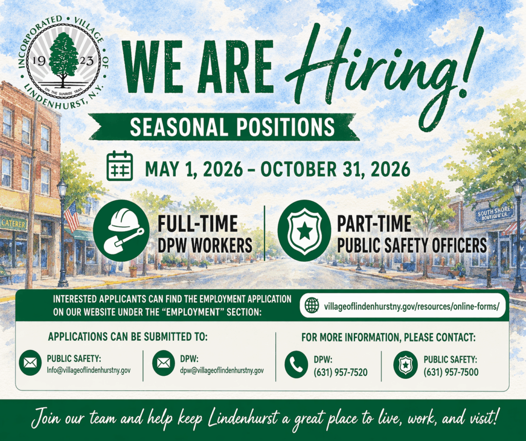 The Village of Lindenhurst is now hiring seasonal positions for Summer 2026.
