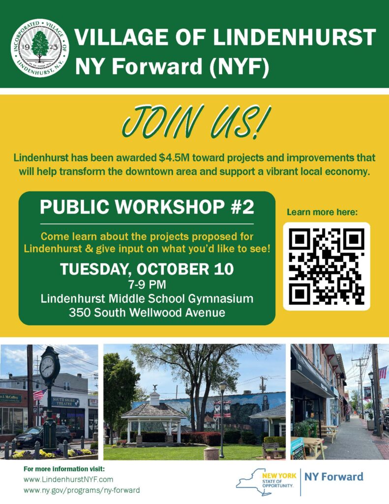 Please join us on October 10, 2023 from 7:00 PM to 9:00 PM at the Lindenhurst Middle School Gymnasium, 350 South Wellwood Avenue for Public Workshop #2 as part of the NY-Forward process.