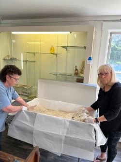 Lindenhurst, NY – During a recent exhibit-organizing work session at the nearly renovated Old Village Hall Museum, Lindenhurst Museum Director Marianne Guglieri and Lindenhurst Village Historian Anna Jaeger paused to demonstrate how newly acquired collection management supplies will expand and improve the Lindenhurst Historical Society’s conservation and preservation supplies and practices. This is the second consecutive year the Lindenhurst Historical Society successfully garnered a NYSCA/Greater Hudson Heritage Network Preservation Supplies Grant. This year’s funding allowed the Society to purchase seven (7) Garment/Textile Preservation Kits.